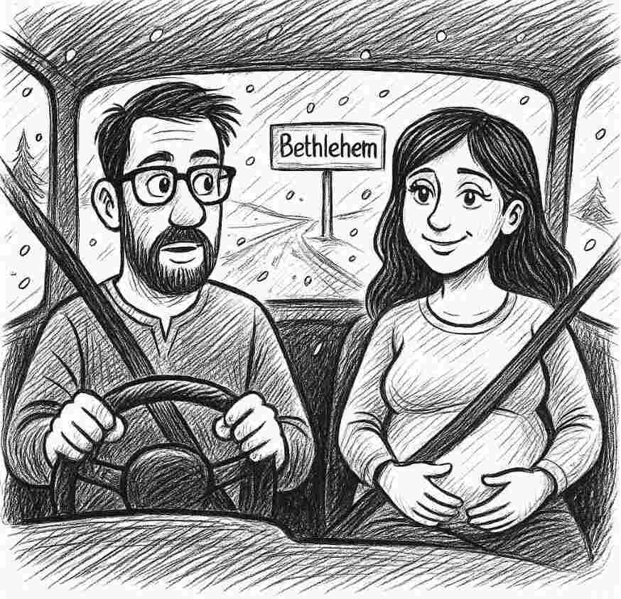 Ich lachte hysterisch, Maria fragte nur: „Ist es dort warm?“, und die Wirtin nickte wie eine Frau, die schon ganz andere Dinge geregelt hat. Und so standen wir da, frierend, erschöpft, und mir wurde klar: Natürlich geht es nach Bethlehem. Wohin auch sonst? Wir haben eine Kleinigkeit gegessen, dann fuhren wir los.