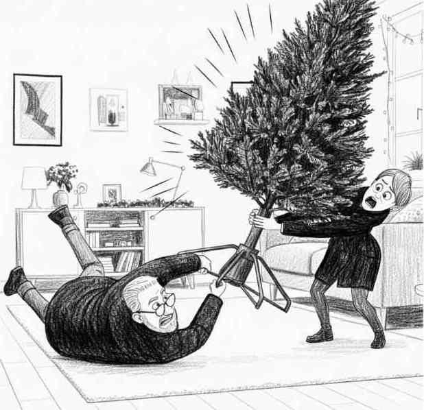„Natürlich“, sage ich, und für einen Moment glaube ich das sogar selbst. Ich greife den Stamm, ziehe vorsichtig und der Baum gleitet wirklich sauber raus. Kein Klemmen. Keine Schramme. Keine Slapstick-Szene. Er liegt stabil in meinen Armen.